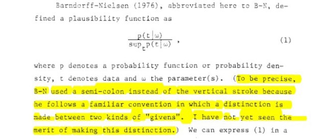 The above is a slightly different way of looking at these issues than that given by e.g. Pawitan, Lee and Nelder – it is instead based on Barndorff-Nielsen’s ideas mentioned above (which in turn derive from Barnard’s). See also here. On the other hand, the basic idea of extended likelihood is to start from the model family considered as a joint likelihood, so the approach considered here is essentially equivalent (but see future posts on nuisance parameters).